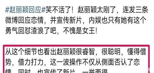 她恋情曝光后面一趟出头,那架势可真不小,立马就又冲上了热搜,标题还挺忽闪——“赵丽颖恋情曝光后首亮相”,那时行家伙儿都以为她会连接推聋做哑,谁知说念她此次竟然启齿了,撂下一句“蹭一个平台热搜,在东说念主间定档了”,这话一出,那叫一个感天动地,粉丝们立马就炸了锅,纷纷夸她“女王步履”,合计她飒得不成,险些等于刚到实验里,果然“不鸣则已,一鸣惊东说念主”。