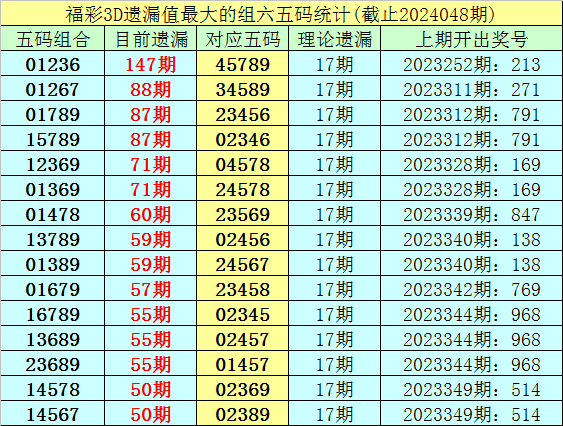 1。甘休第24048期,五码组六遗漏最大的是:01236,面前遗漏147期。